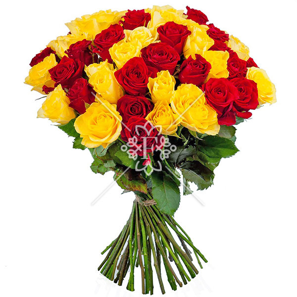 роза красная и жёлтая - 51 шт., упаковка, лента.